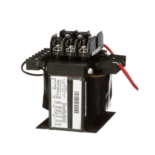 Square D 9070TF250D50 Class 9070 Type TF Transformer 250 VA Output (VoltAmp). 240/416/480/600 VAC to 99/120/130 VAC OR 230/400/460/575 VAC to 95/115/125 VAC OR 220/380/440/550 VAC to 90/110/120 VAC OR 208/360/416/520 VAC to 85/104/115. 4.5" x 3.75" x 5.3" (HxWxD). Includes 2 primary fuse blocks and 1 secondary fuse block mounted on top of transformer. Includes rejection-style clips to increase the AIC ratings for the fuses. Low impedance windings for excellent voltage regulation. Accomodates high inrush currents from relays, starters, solenoids, contactors etc.