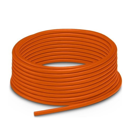 Phoenix Contact 1501809 The specified cable is a 3-wire, halogen-free, orange-colored PUR (polyurethane-based) insulated copper cable, meeting the RAL standard 2003. It has a single, colored wire and is available in a 100-meter length.
