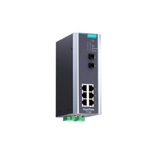 Moxa PT-508-SS-SC-HV Managed Ethernet Switch (Din Rail Mount) IEC 61850-3 Power Substation certification with a total of 8 ports including 6 Fast Copper ports RJ45 (100 Mbps) and 2 Fast Fiber ports SC Single-Mode (100 Mbps). Operating Temperature: -40 to 185°F. Redundant power inputs 110-220 VDC/VAC VDC Power Supply.