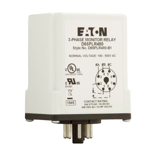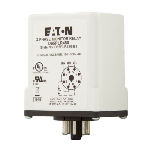 Eaton D65PLR480 - D65 Series Phase Loss Reversal Monitoring Relay, 240-480V voltage rating, Plug-in octal, DIN rail