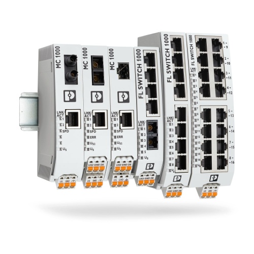 Phoenix Contact 1084159 An Ethernet switch with a compact design features four standard RJ45 ports and one fiber optic (FO) port, supporting speeds of up to 100 Mbps full-duplex in the SC-D format, automatically detecting data transmission speeds between 10 and 100 Mbps via RJ45 connections, and also includes an autocrossing function.