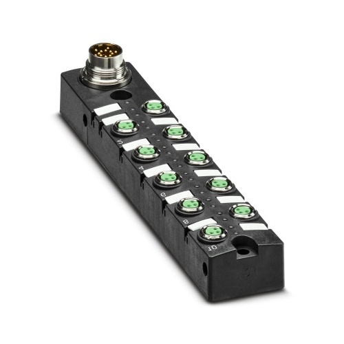Phoenix Contact 1192187 The distributor box features a M8 socket for connection, accommodating 10 slots and 3 positions. It lacks a status display and does not have a master cable connection with an M16 plug, nor is it shielded, making it suitable for customer versions.