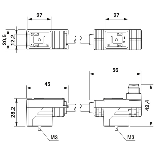 Phoenix Contact 1458282 A double valve connector adapter is available in universal configuration, featuring four positions that can be used with PUR/PVC materials, specifically black RAL 9005 color. The adapter has a straight M12 SPEEDCON plug and comes coded as "A" on Valve connector B (10 mm), which is also equipped with one LED light source. Additionally, the wiring options include a Z diode connected to Valve connector B (10 mm) and another Z diode configuration without an LED, with recommended valve connector spacing of 0.1 meters between components.