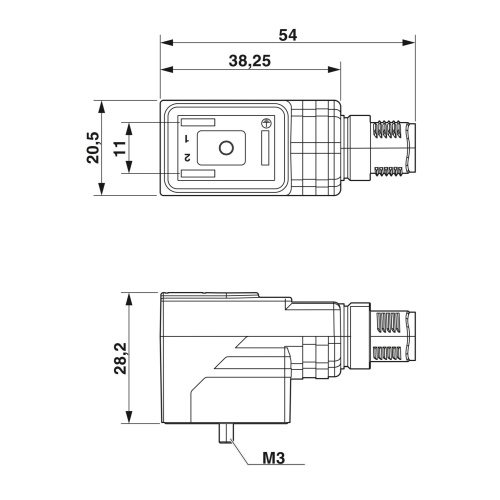 Phoenix Contact 1409724 The valve connector has a 3-position design with an M12 threaded plug and a coded A designation, featuring a 11mm diameter socket for the BI valve, accompanied by one LED light source and utilizes a Z diode wiring configuration, with the pin connector on the valve plug rotated 180 degrees.
