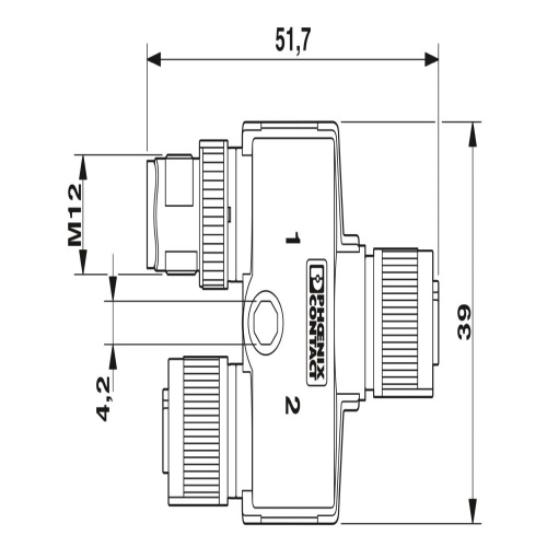 Phoenix Contact 1419933 A 5-position Y distributor with a shielded socket featuring the SPEEDCON M12 coding system, applied to both the socket's straight M12 configuration and its corresponding plug in a parallel setup.