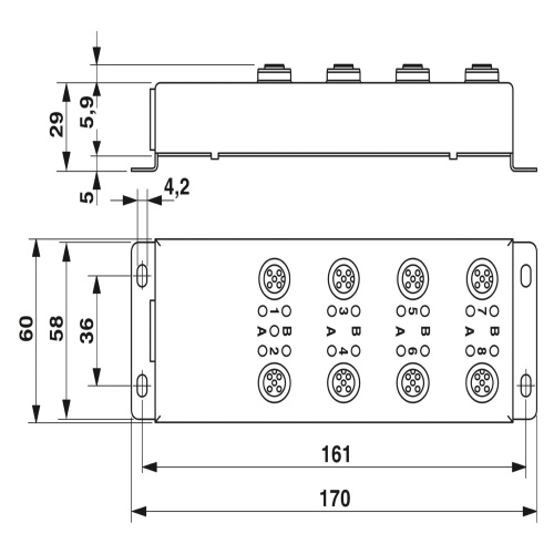 Phoenix Contact 1403355 The distributor box is used in the food processing industry and has a fixed connection with a master cable via an M12 socket. The device features eight slots and five positions for accommodating various components. It also includes a status display indicating its operational state. The master cable is attached using PVC material, extending up to 30 meters in length, although it lacks shielding.