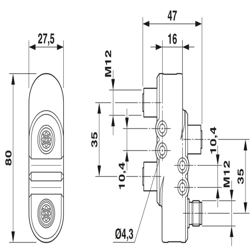 Phoenix Contact 1080246 A shielded, 5-position plug with a straight M12 connector is part of the distribution system, featuring a coding of K. This plug is used in conjunction with a socket that also has a coding of K and another socket with the same coding, all for use with alternating current up to 16 amps at 630 volts, and is designed as a parallel distributor.