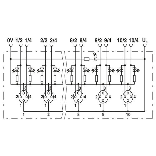 Phoenix Contact 1197319 The distributor box is a standard component with a metal body containing 8 slots and 4 positions. It has an A coding and uses double slot assignment. The status of the connections can be displayed, and it has a fixed connection type with a cable length of 10m. The cable is made of PUR/PVC material and does not have shielding, with a connection angle of 180 degrees to the master cable.