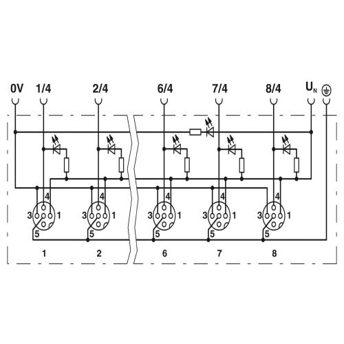 Phoenix Contact 1405738 A distributor box features an M12 socket with 8 plastic slots and 4 positions. It uses a specific coding system A and has single slot assignment, as well as status display capabilities. The npn master cable connection is fixed at an angle of 180 degrees, with a PUR/PVC cable length of 10 meters.