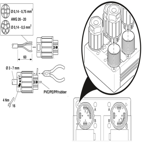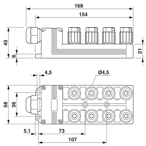 Phoenix Contact 1156004 A distributor box with a QUICKON connection method is available in two different cable sizes, 0.14 mm² to 0.75 mm², and features eight slots that accommodate five positions, arranged in a double configuration, with no status display provided. The master cable connection is pluggable using a screw connection at 180°, and it does not have shielding. When connecting up to five conductors, the maximum allowable cross-sectional area of the cables is 0.5 mm².