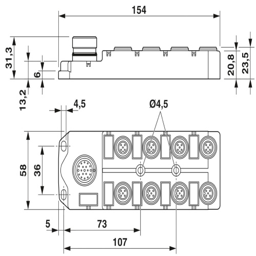 Phoenix Contact 1155996 The distributor box is designed for standard and extended applications with a metal/M12 PUSH-PULL female connector and 8 slots. It features 5 positions, coded as A, with double slot assignment and no status display. The master cable connection uses an M23 plug at 180° angles, ensuring shielding.