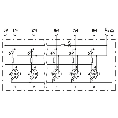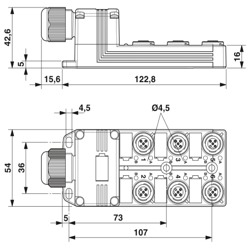 Phoenix Contact 1452880 The distributor box header is a standard component with a M12 socket connection and features 6 slots for various applications. Each of the 4 positions has a unique coding system (A) and can be assigned individually, while a status display indicator shows the PNP master cable connection via a pluggable screw connection that lacks shielding.