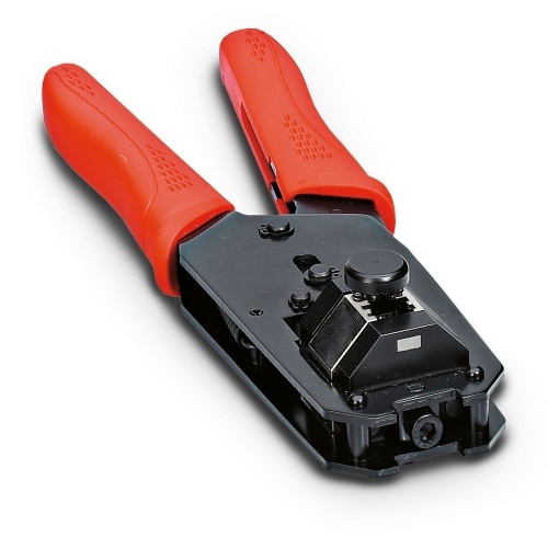 Phoenix Contact 1653265 A crimping tool used specifically with 8-position modular connectors featuring an RJ45 pin insert type, such as the VS-08-ST-H or VS-08-RJ45-10G/C models, typically involves pliers equipped with a die that allows for precise and secure crimping of the pins to their respective sockets.