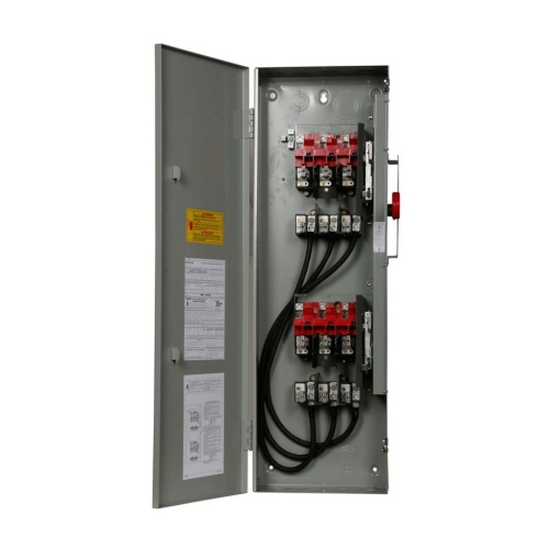 Eaton DT323FGK - Double-throw switches are designed for transferring power between different sources or switching between load circuits. They have a wide range of ratings from 30 to 1200 A and are horsepower rated with a maximum voltage of 600 Vac and 250 Vdc. These switches are available in both fusible and non-fusible options, with fusible switches utilizing a common set of fuses for the stacked double-throw design. They are suitable for service entrance applications and offer reliable load break and load make capabilities. The switches feature a visible double-break quick-make, quick-break rotary blade mechanism for easy operation and longer contact life. They have triple padlocking capability, deionizing arc chutes to suppress arcs, additional locking capability, and a clear line shield for protection against accidental contact. The switches also provide ample wire bending space, tangential knockouts for neat installation, and clear handle visibility.