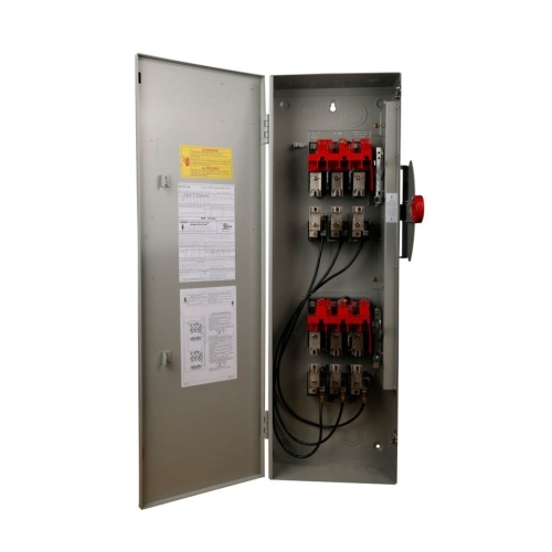 Eaton DT321FGK - Double-throw switches are designed for transferring power between different sources or switching between load circuits. They have a wide range of ratings from 30 to 1200 A and are horsepower rated with a maximum voltage of 600 Vac and 250 Vdc. These switches are available in both fusible and non-fusible options, with fusible switches utilizing a common set of fuses for the stacked double-throw design. They are suitable for service entrance applications and offer reliable load break and load make capabilities. The switches feature a visible double-break quick-make, quick-break rotary blade mechanism for easy operation and longer contact life. They have triple padlocking capability, deionizing arc chutes to suppress arcs, additional locking capability, and a clear line shield for protection against accidental contact. The switches also provide ample wire bending space, tangential knockouts for neat installation, and clear handle visibility.