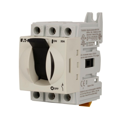 Eaton T5B3060U - The R5 Series is a line of modular switches that are manually operated and designed for low voltage circuits, specifically for machine and control circuits. These switches provide load break switching and isolation, ensuring safety in various applications. They are UL 508 listed and can be used as motor disconnects. Key features include a high short-circuit rating of up to 65 kA, options for direct or external operation, compact footprint, compatibility with DIN rail or base mounting, a wide range of accessories, and the ability to accommodate up to eight-pole or four-pole MTS configurations. The R5 Series offers both open and enclosed devices, with a modular design and integrated terminals for enhanced safety. The switches have a padlockable design for direct, toggle, and external handles, and they can also be reverse fed if needed.