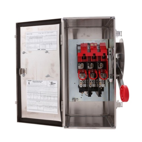 Eaton DH321FWK - The heavy-duty switches offered are designed for demanding commercial and industrial applications, providing reliable performance and service continuity. Available in 30-1200 A range, these switches are suitable for service entrance and feature fusible and non-fusible options. With deionizing arc chutes, visible ON/OFF indication, and a mechanically interlocked cover, they offer enhanced safety and durability. The switches come in premium 316-grade stainless steel enclosures for corrosion resistance and have additional features like clear line shields, triple padlocking capability, and interlocking mechanisms. Compliant with UL listing and seismic qualifications, these switches ensure reliable operation in challenging industrial environments.
