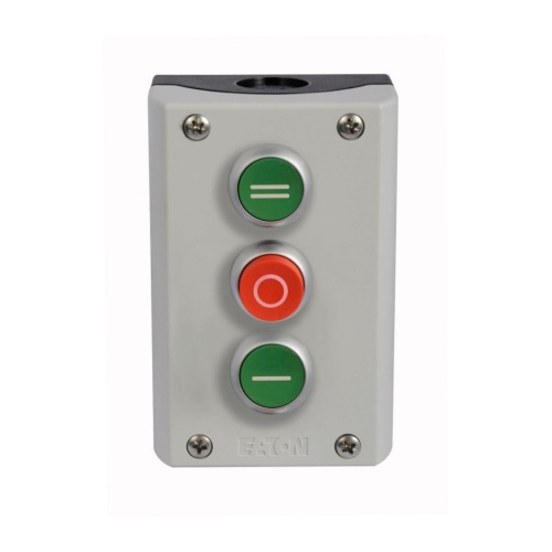 Eaton M22-C3-M3H - 22.5 mm, Buttons: flush, extended, flush, Momentary, Non-illuminated, Button: Green, Red, Green, I, O, II/ X1, X0, X2, NO, NC, NO, IP66, UL (NEMA) Type 4X, 13, Horizontal, Base: Black, Enclosure: Gray *NON-CANCELLABLE, NON-RETURNABLE*