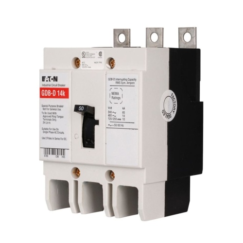 Eaton GDB3050D - G-frame, GDB, Complete breaker, Fixed thermal, fixed magnetic trip, Three-pole, 50A, 480 Vac, 125/250 Vdc, 14 kAIC at 480 Vac, Line and load, 50/60 Hz, Ring type, Ring type