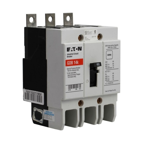 Eaton GDB3090D - G-frame, GDB, Complete breaker, Fixed thermal, fixed magnetic trip, Three-pole, 90A, 480 Vac, 125/250 Vdc, 14 kAIC at 480 Vac, Line and load, 50/60 Hz, Ring type, Ring type