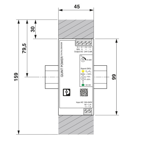 Phoenix Contact 2904599 The QUINT POWER is a primary-switched power supply unit with screw connections and can be mounted on a DIN rail. It accepts a 1-phase input and provides a 24V DC output of up to 3.8A.