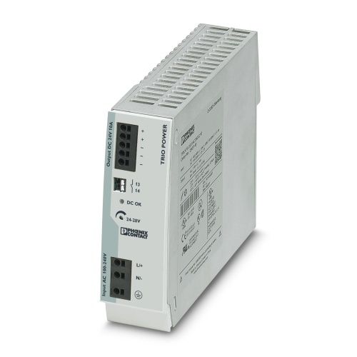 Phoenix Contact 2903149 A primary-switched Trio Power power supply is available for DIN rail mounting via a push-in connection and features an input compatible with single-phase power and produces an output of 24V DC at 10A.