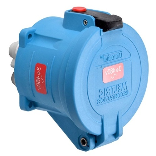 Meltric 33-64047-824-NC - Poly - Blue - Min Wire Size: 10 AWG - Max Wire Size: 2 AWG - 277 Volt, 480 Volt - 60 Amp - 3P+N+G - 60 Hz - IP 66, IP 67,IP 69 - Size: 4 - Metal Pawl (On Poly Receptacle), Normally Closed Lid