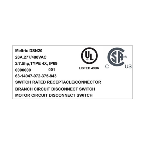 Meltric 63-14047-972-375-843 - DSN20 Series - Switch Rated,Branch Circuit Disconnect Switch,Motor Circuit Disconnect Switch - 2 HP, 7.5 HP - (-40F°-140F°) - UL 1682, UL 2682, cCSAus, C22.2 No. 182.1-13 - Type 4X - +2 Aux