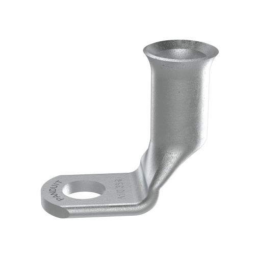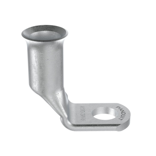 Panduit A1/0-38RF-C Copper Compression Battery Cable Lug, 1/0 AWG, 3/8" Stud with a 90 degree bend are tin plated to meet ASTM Class C specification for corrosion resistance. Manufactured with a standard barrel without an inspection window preventing contaminents from entering. Flared barrel entry for ease of inserting flex conductors. High pullout strength for heavy duty applications and military pullout strength requirements when using Panduit recommended tooling. - Consult cable manufacturer for voltage stress relief instructions with applications greater than 2000 V