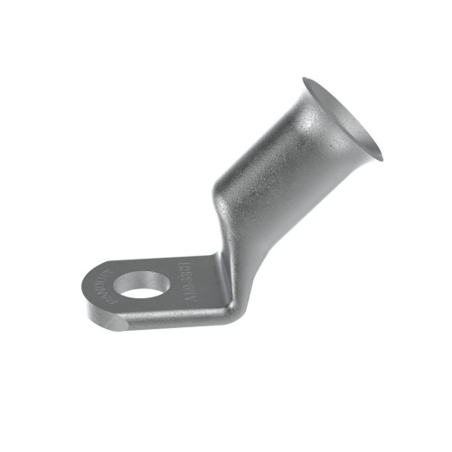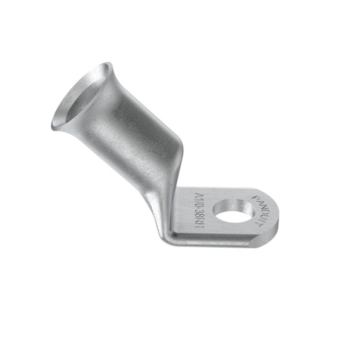Panduit A1/0-38RH-C Copper Compression Battery Cable Lug, 1/0 AWG, 3/8" Stud with a 45 degree bend are tin plated to meet ASTM Class C specification for corrosion resistance. Manufactured with a standard barrel without an inspection window preventing contaminents from entering. Flared barrel entry for ease of inserting flex conductors. High pullout strength for heavy duty applications and military pullout strength requirements when using Panduit recommended tooling. - Consult cable manufacturer for voltage stress relief instructions with applications greater than 2000 V