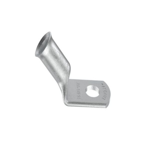 Panduit A6-14RH-C Copper CompressionBattery Cable Lug, 6 AWG, 1/4" Stud with a 45 degree bend are tin plated to meet ASTM Class C specification for corrosion resistance. Manufactured with a standard barrel without an inspection window preventing contaminents from entering. Flared barrel entry for ease of inserting flex conductors. High pullout strength for heavy duty applications and military pullout strength requirements when using Panduit recommended tooling. - Consult cable manufacturer for voltage stress relief instructions with applications greater than 2000 V