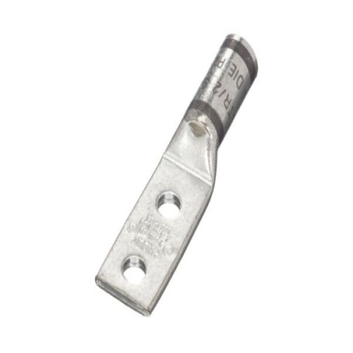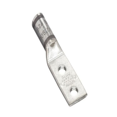 Panduit LCD4-10A-L - Two-hole, standard barrel lug with window, #4 — #3 AWG STR, #2 AWG SOL wire, #10 stud hole, .63 hole spacing.