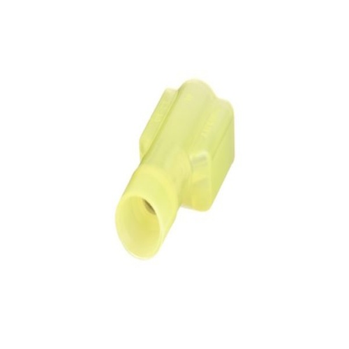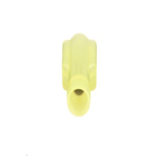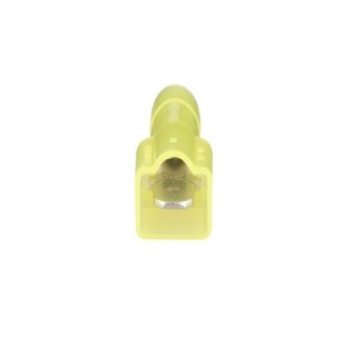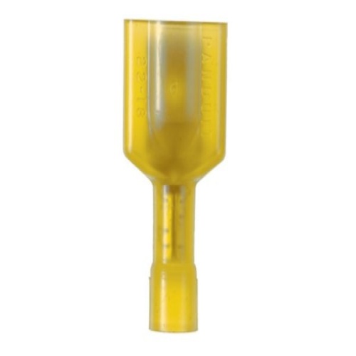 Panduit DNF10-250FIMB-Q - The vibration resistant male tab disconnect is made of copper and is nickel-plated. It is fully insulated in a yellow, oversized nylon housing. It has a tab size of 0.250 x 0.032" (6.3 x 0.8 mm) and supports a wire range of 12-10 AWG (4.0-6.0 mm²). It is 0.96" (24.4 mm) long and 0.22" (5.6 mm) wide. The disconnect has a standard barrel configuration and a butted seam barrel. It comes in bottles of 25. - DNF10-250FIMB-Q replaces DNF10-250FIMB-L