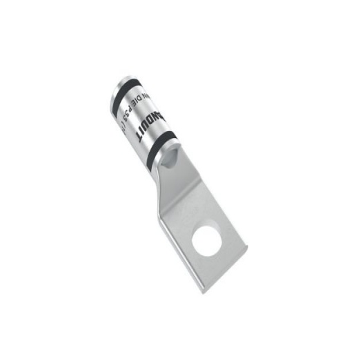 Panduit LCA2-56-Q Tin-Plated Copper Compression Lug, one-hole, standard barrel, has color-coded barrels marked with Panduit and specified competitor die index numbers for proper crimp die selection. An inspection window aids to visually assure full conductor insertion, and the tin-plate material helps to inhibit corrosion. UL Listed and CSA Certified to 35 KV and temperature rated to 90°C.