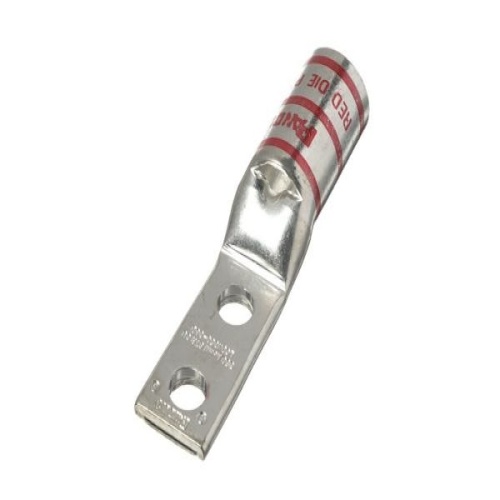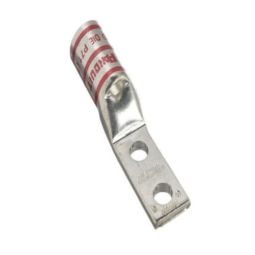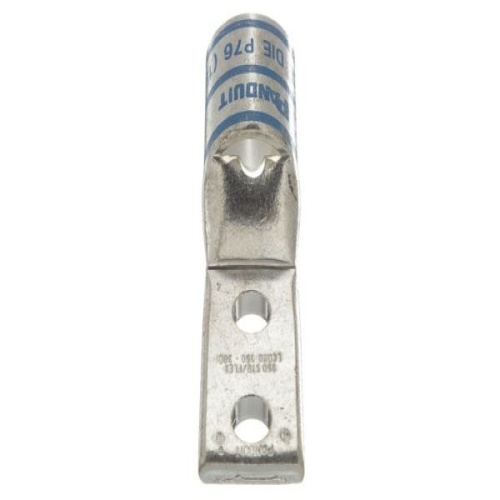 Panduit LCDN350-38D-X - Two-hole, standard barrel with window, narrow tongue lug, 350 kcmil cable, 3/8 stud hole, 1 hole spacing.
