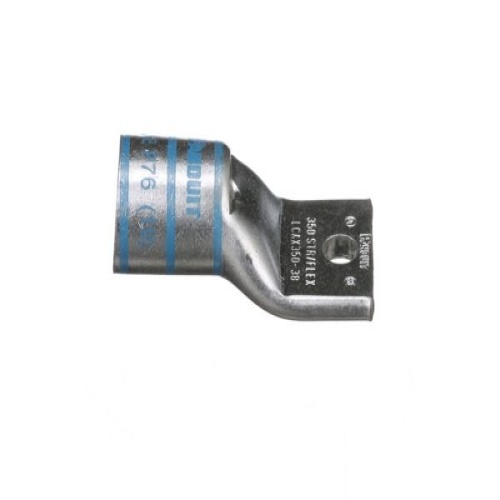 Panduit LCAX350-38-6 Tin-Plated Copper Compression Lug, one-hole, standard barrel, has color-coded barrels marked with Panduit and specified competitor die index numbers for proper crimp die selection. An inspection window aids to visually assure full conductor insertion, and the tin-plate material helps to inhibit corrosion. UL Listed and CSA Certified to 35 KV and temperature rated to 90°C.