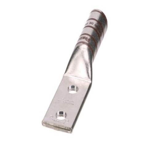 Panduit LCC500-12-6 Tin-Plated Copper Compression Connector Lug, two-hole, long barrel, has color-coded barrels marked with Panduit and specified competitor die index numbers for proper crimp die selection. The long barrel maximizes the number of crimps and provides premium wire pull-out strength and performance. The enclosed barrel prevents corrosive material from entering the barrel when used in harsh environments. UL Listed and CSA Certified.