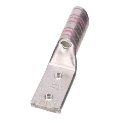 Panduit LCCX500-12-6 Tin-Plated Copper Compression Connector Lug, two-hole, long barrel, has color-coded barrels marked with Panduit and specified competitor die index numbers for proper crimp die selection. The long barrel maximizes the number of crimps and provides premium wire pull-out strength and performance. The generously beveled wire entry prevents bent back strands when inserting the conductor into the barrel. UL Listed and CSA Certified.