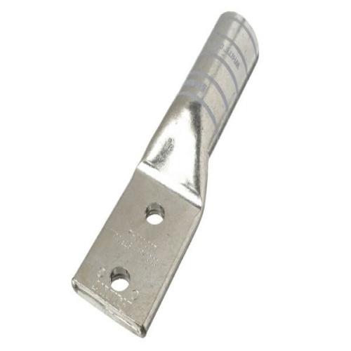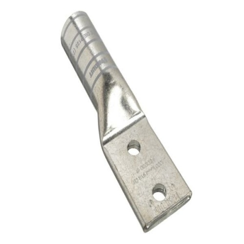 Panduit LCC1000-12-3 Tin-Plated Copper Compression Lug, two-hole, long barrel, has color-coded barrels marked with Panduit and specified competitor die index numbers for proper crimp die selection. The long barrel maximizes the number of crimps and provides premium wire pull-out strength and performance. The generously beveled wire entry prevents bent back strands when inserting the conductor into the barrel. UL Listed and CSA Certified.