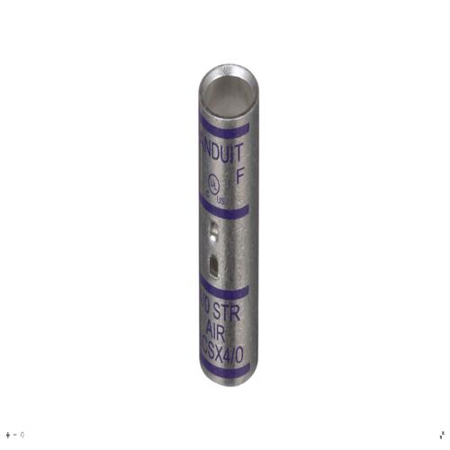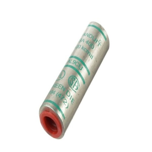 Panduit SA400-X - Aluminum Compression Splice, Tin-Plated to inhibit corrosion, high conductivity thick wall aluminum, Factory pre-filled joint compound and sealed with easy pull-out end plug to inhibit corrosion, Panduit and specified competitor die index numbers marked on barrel for proper crimp die selection, Internal solid stop prevents over-insertion of conductor, UL Listed and CSA Certified to 35 KV and temperature rated to 90C when crimped with Panduit and specified competitor crimping tools and dies.