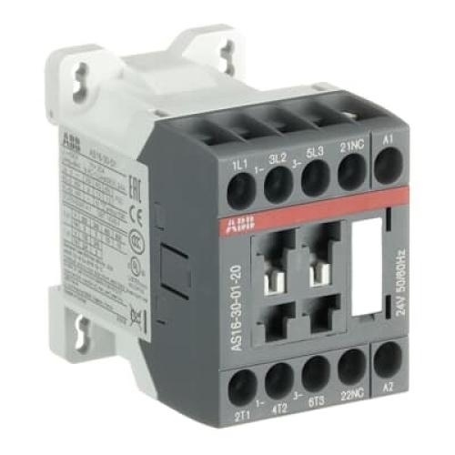 ABB AS16-30-01-20 - AS16 contactors are mainly used for controlling 3-phase motors and generally for controlling power circuits up to 690 V AC or 220 V DC. They are mainly used for controlling 3-phase motors, non-inductive or slightly inductive loads. The AS... series 1-stack 3-pole contactors are of the block type design. - Main poles and auxiliary contact blocks: 3 main poles, 1 built-in auxiliary contact, front-mounted add-on auxiliary contact blocks (mechanically-linked auxiliary contacts compliant with Annex L of IEC 60947-5-1. N.C. mirror contacts compliant with Annex F of IEC 60947-4-1) - Control circuit: AC operated with laminated magnet circuit - Accessories: a wide range of accessories is available.