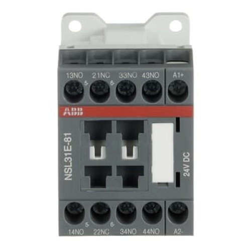 ABB NSL31E-81 - NSL... contactor relays are used for switching auxiliary circuits and control circuits. - Poles and auxiliary contacts blocks: 4-pole contactor relays, front-mounted add-on auxiliary contact blocks (mechanically-linked auxiliary contacts compliant with Annex L of IEC 60947-5-1 including the "Mechanically Linked" symbol on the contactor relay side) - Control circuit: DC operated with solid core magnet circuit. The polarity on the coil terminals (A1+ and A2-) must be respected - Accessories: a wide range of accessories is available NSL... contactors are fitted with low consumption DC coils and are suitable for a direct control by PLC outputs.