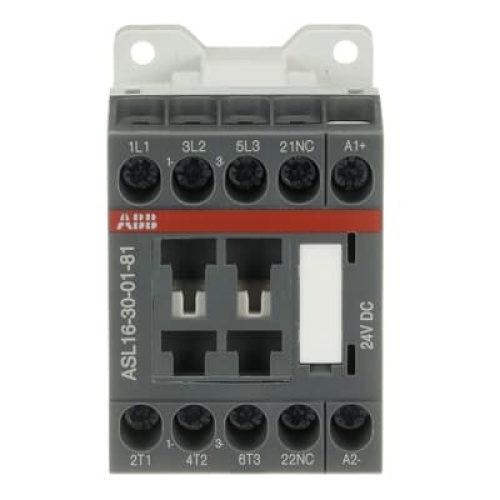 ABB ASL16-30-01-81 - ASL16 contactors are mainly used for controlling 3-phase motors and generally for controlling power circuits up to 690 V AC or 220 V DC. They are mainly used for controlling 3-phase motors, non-inductive or slightly inductive loads. The ASL... series 1-stack 3-pole contactors are of the block type design. - Main poles and auxiliary contact blocks: 3 main poles, 1 built-in auxiliary contact, front-mounted add-on auxiliary contact blocks (mechanically-linked auxiliary contacts compliant with Annex L of IEC 60947-5-1. N.C. mirror contacts compliant with Annex F of IEC 60947-4-1) - Control circuit: DC operated with solid core magnet circuit. The polarity on the coil terminals (A1+ and A2-) must be respected - Accessories: a wide range of accessories is available. ASL... contactors are fitted with low consumption DC coils and are suitable for a direct control by PLC outputs.
