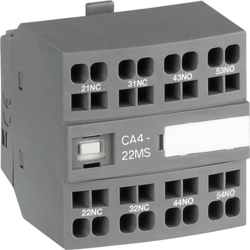 ABB CA4-22MS is a 4-pole front mounted auxiliary contact block equipped with spring terminals. CA4-..M version offers terminal assortment matching the marking of 3-pole AF26(Z)(B)..96-30-00, AF40..96-30-11, AFC26..38-30-00, 4-pole AF09(Z)(B)..80-40-00 / AFC09..38-40-00 or AF09(Z)(B)..80-22-00 / AFC09..38-22-00 contactors. CA4-22MS is available with 2 N.O. and 2 N.C. instantaneous contacts for standard industrial environments. - Used With: Block Contactors