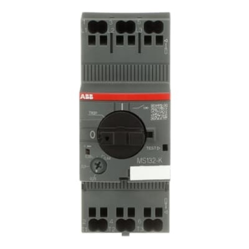 ABB MS132-0.4K - The MS132-0.4K manual motor starter (also known as motor protection circuit breaker or manual motor protector) is a compact 45 mm width device with a rated operational current of Ie = 0.40 A with Push-in spring terminals. This device is used to manually switch on and off motors and to protect them reliably and without the need for a fuse from short-circuits, overload and phase failures. The MS132-K manual motor starter offers a rated service short-circuit breaking capacity Ics = 100 kA at 400 VAC and trip class 10. Further features are the build-in disconnect function, temperature compensation, trip-free mechanism and a rotary handle with a clear switch position indication. The MS132-K manual motor starter is suitable for three- and single-phase applications. The handle is lockable to protect against unauthorized changes. Auxiliary contacts, signaling contacts, undervoltage releases, shunt trips and terminal spacers are available as accessory.,