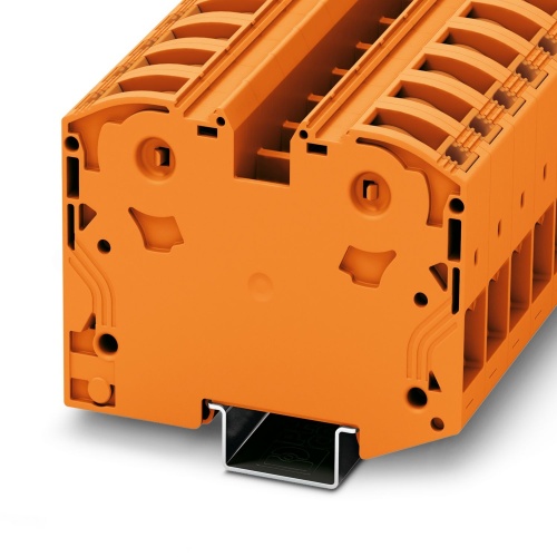 Phoenix Contact 3212095 The terminal block features a high-current rating with a nominal voltage of 1000 V and a maximum current capacity of 125 A, accommodating two connections and one connection position, utilizing the PowerTurn connection method. The rated cross-sectional area is 35 mm2, with a minimum and maximum value of 2.5 mm2 to 35 mm2, and it is mounted using an NS 35/15 type bracket in orange color.
