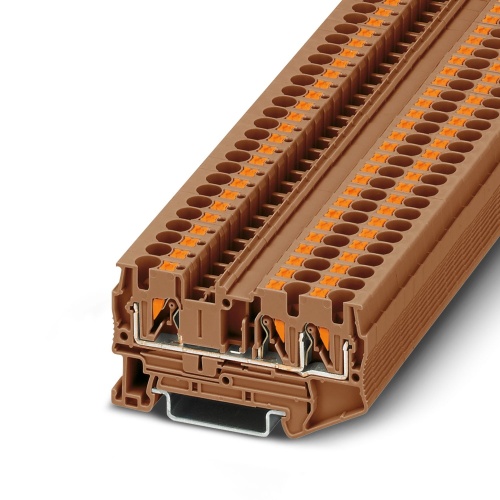 PT 4-TWIN BN Phoenix Contact 3211254 Feed Through Terminal Block - PT 4-TWIN BN Push-In Connection 1 Level 6.2 mm with 3 Connections. Not Grounded, Not Fused Brown. 800 V, 36 A max rating.