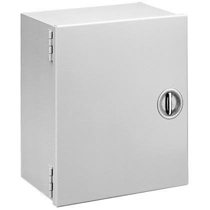 nVent Hoffman A20N206LP Hinged-Cover with Recessed Handle, Type 1 Painted Steel Enclosure with hinged cover and recessed T-handle latch, Type 1 for indoor use and meet basic functionality requirements for housing instumentation and controls. Mounting holes on back of enclosure, flush cover and offset body with Gray powder coat finish inside and out. Studs for adding backplate for mounting equipment.