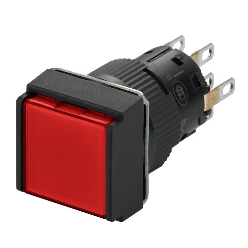 Schneider Electric XB6ECW4B2P Harmony 16 mm Square Red Plastic Push Button that is Illuminated with a Flush profile. Uses 24 VDC and is a Monolithic Complete Product and has 2 C/O Fast Connector Sockets and is IP 65 rated and UL 508 certified. (MUST BUY IN PACKS OF 5)