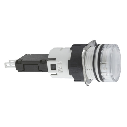 Schneider Electric XB6AV1BB Harmony 16 mm Round White Plastic Pilot Light that is Illuminated . Uses 12-24 V AC/DC and is a Modular Complete Assembly and has Faston Connectors and is IP 65 rated and UL 508 certified.